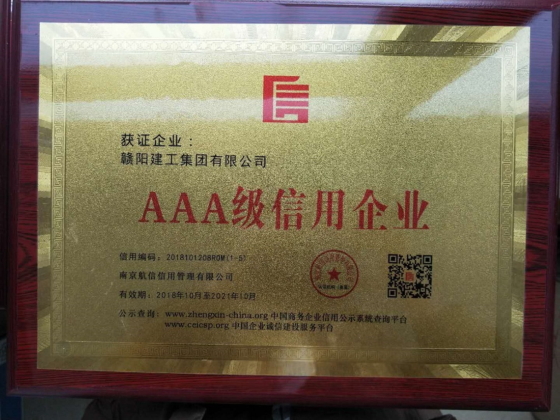 热烈祝贺赣阳建工集团荣获AAA级诚信经营示范单位、AAA级信用企业、AAA级质量服务诚信单位、AAA级重合同守信用企业、AAA资信等级、招投标企业信用评价AAA级信用企业、中国建筑行业AAA级诚信单位、中国诚信企业家等八项荣誉。