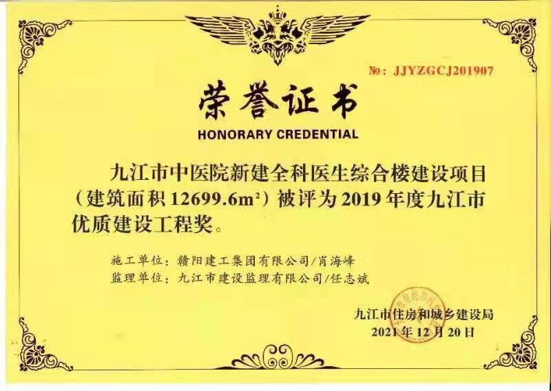 热烈祝贺:赣阳建工集团有限公司承接的九江市中医院新建全科医生综合楼建设项目于2021年12月20日被评为2019年度九江市优质建设工程奖!