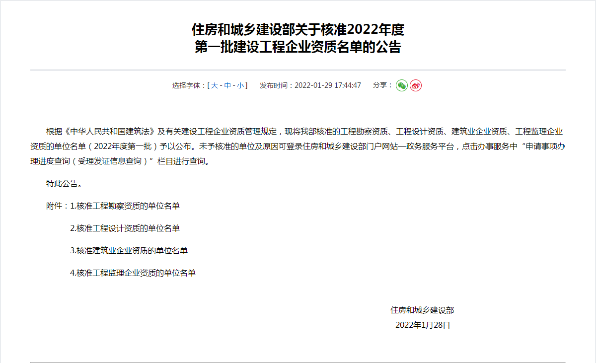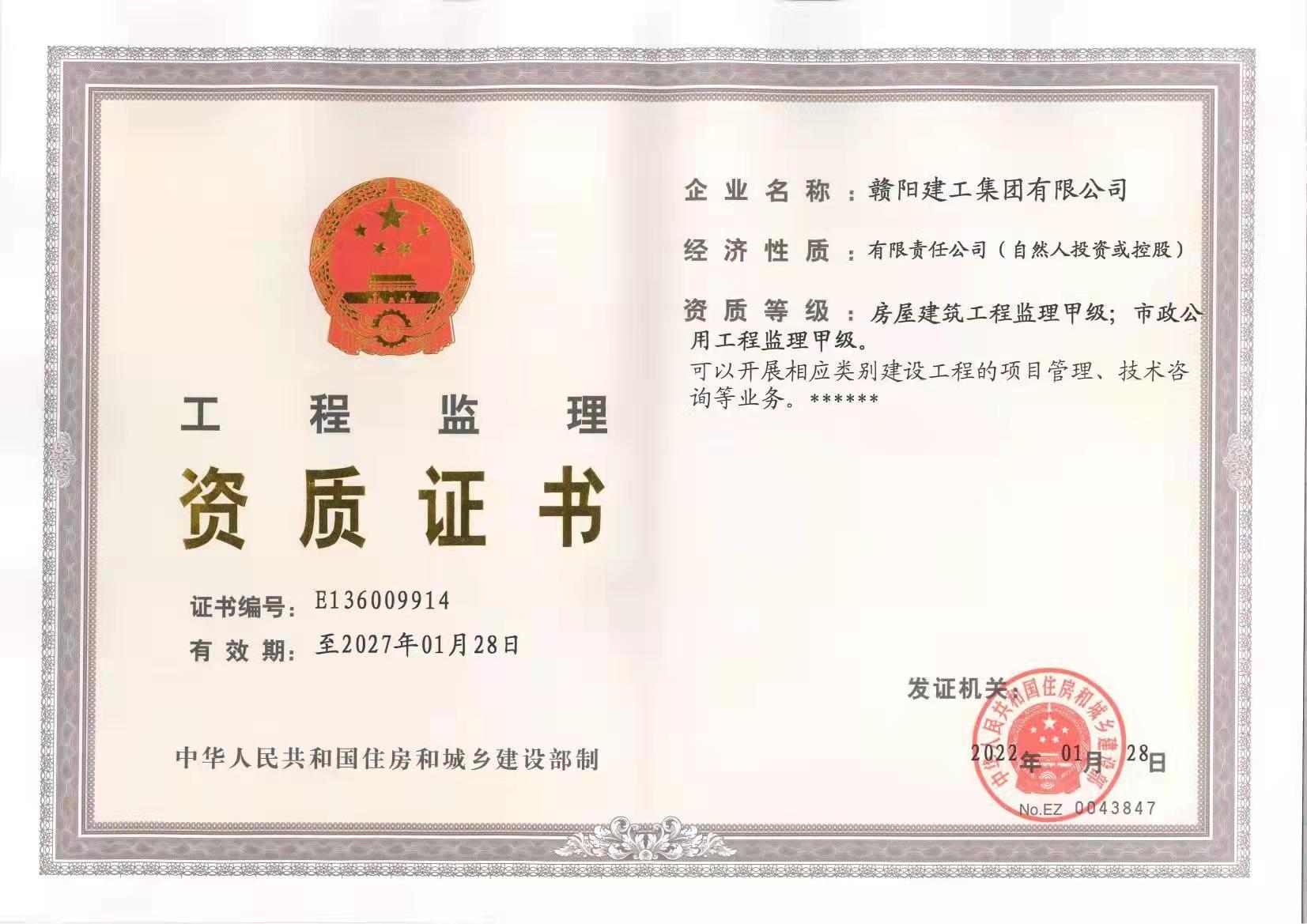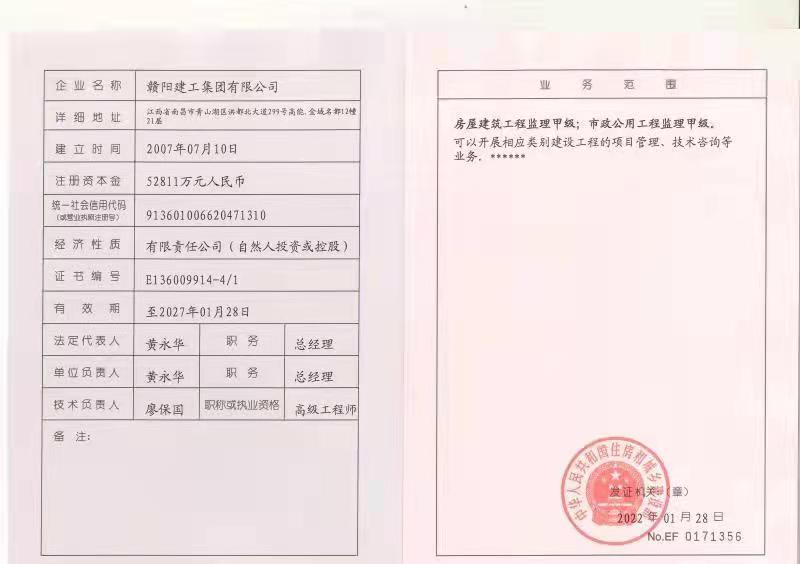 2022129日住房和城乡建设部公布了2022年度 第一批建设工程企业资质的名单,赣阳建工集团有限公司荣获了房屋建筑工程监理甲级以及市政公用工程监理甲级!工程监理资质的取得,标志着我司在业务拓展领域迈上了新的台阶。